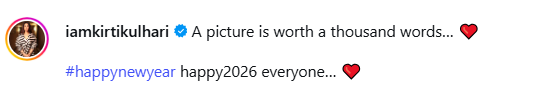 कीर्ति कुल्हारी ने गुरुवार को सोशल मीडिया में राजीव सिद्धार्थ के साथ कई रोमांटिक तस्वीरें शेयर कर रिलेशनशिप ऑफिशियल किया है। इसके साथ उन्होंने कैप्शन में लिखा है, एक तस्वीर हजार शब्दों के बराबर होती है। नया साल मुबारक, हैप्पी 2026 आप सभी को।